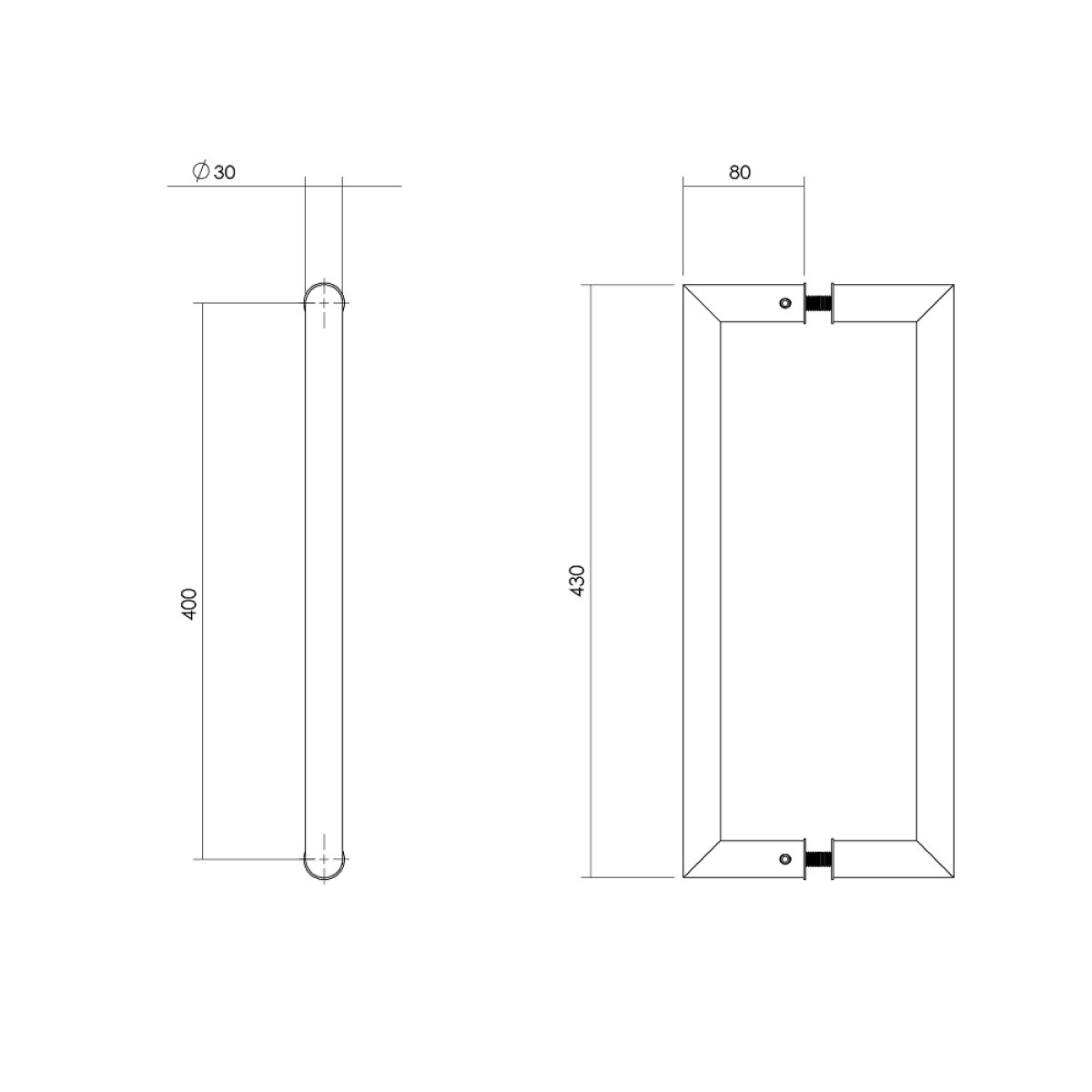 Description Door handles per pair straight-90° 430x80x30 HoH 400 stainless steel: