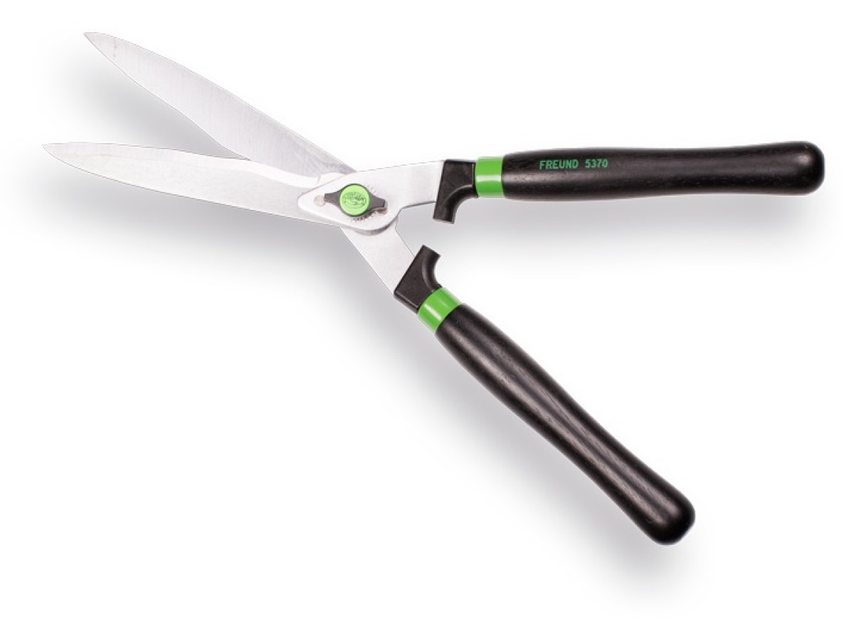 Light hedge trimmer Freund 5370, length 55 cm with stop damper and wavy blade edge. The corrugated blade provides resistance and easily trims woody hedges.
