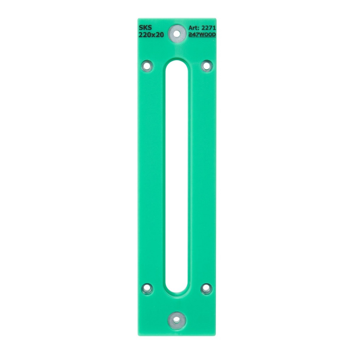 Loose front plates in different lengths and widths. Each front plate from the SKS lock case milling jig series can be attached to any side plate set. Because you can purchase the front and side plates separately, it is possible to further expand existing sets or to put together a set yourself. The router must be equipped with a copy of 24 mm and a cutter with a diameter of 18 mm