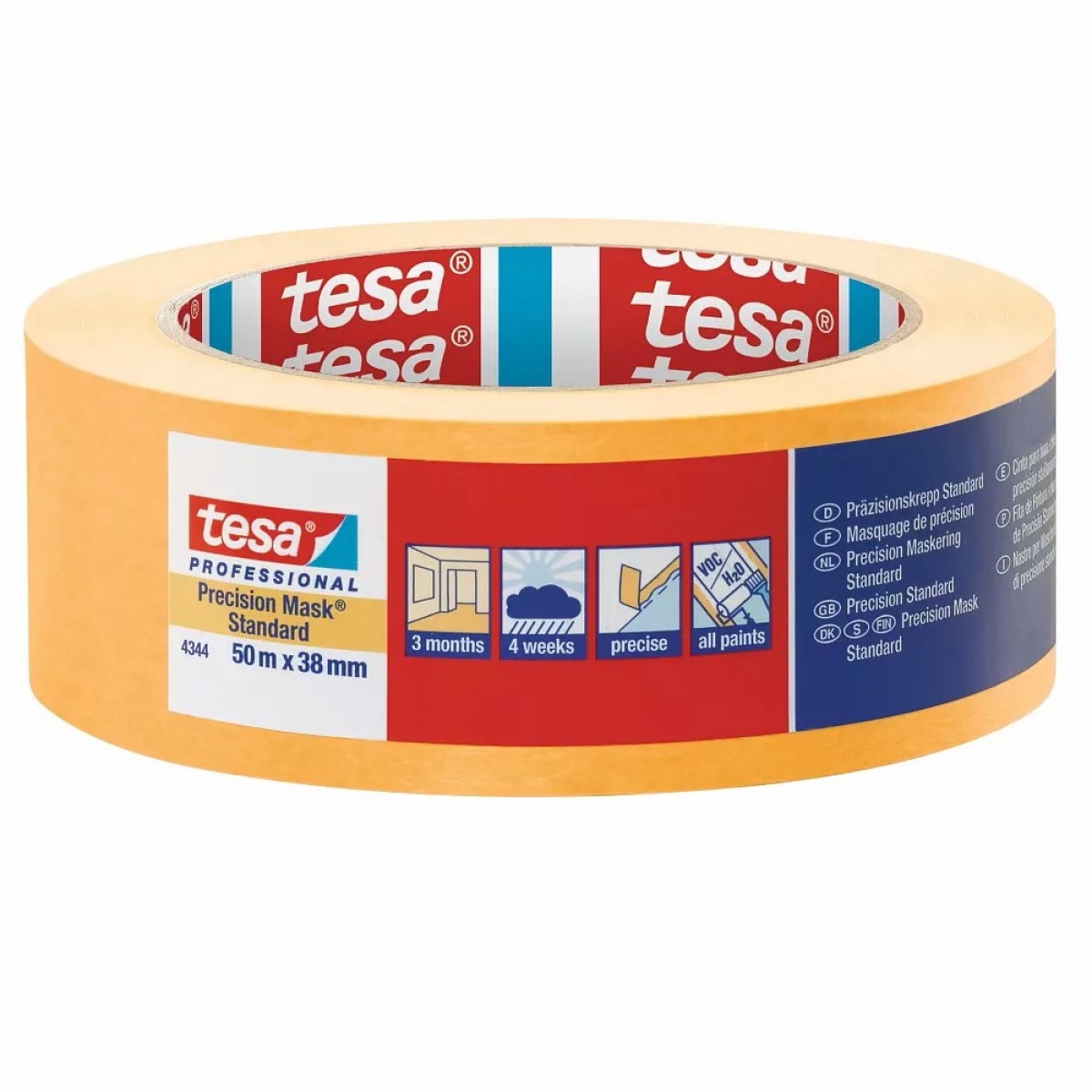 Tesa® 4344 Precision Mask consists of an extra thin and strong washi carrier coated with an acrylic adhesive. The combination of the excellent carrier with the very good special adhesive formula ensures that the tape is still easily removable for up to 3 months after application. This allows multiple work processes with only one covering. The tape is suitable for almost all interior painting jobs. tesa® 4344 Precision Mask can be applied to water-based paints and varnishes and is suitable for high-quality spatula techniques. The tape is suitable for many common surfaces such as glass, aluminum, hard PVC and wood. It is ideally suited for indoor applications where razor sharp paint edges are required.