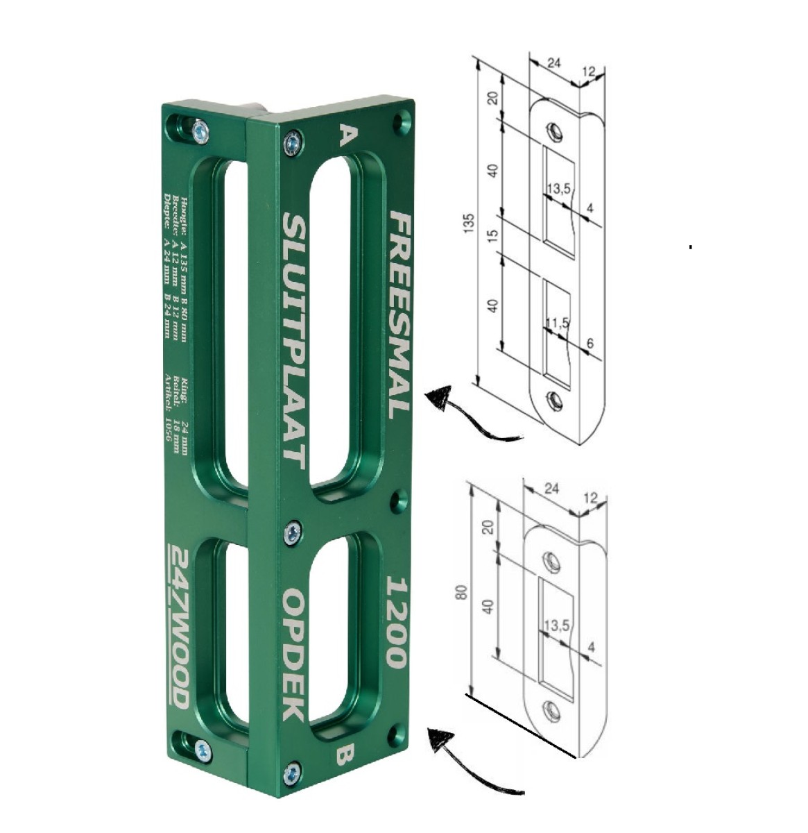 Met deze freesmal freest u gemakkelijk de (vrij bezet & loop) sluitplaten van de NEMEF 1200 serie in een opdek kozijn. Door de hoekvorm van de freesmal is het mogelijk om de sluitplaten in een opspanning uit te frezen, waarbij de bovenfrees op de zelfde diepte instelling kan blijven. De mal is volledig CNC bewerkt en gemaakt van een zeer hoogwaardige aluminium legering. Voor correct gebruik van de freesmal dient u de bovenfrees uit te rusten met een 24 millimeter kopieerring en een 18 millimeter frees. De freesmal is voor zowel de sluitplaten voor linksdraaiende als rechtsdraaiende deuren infrezen.