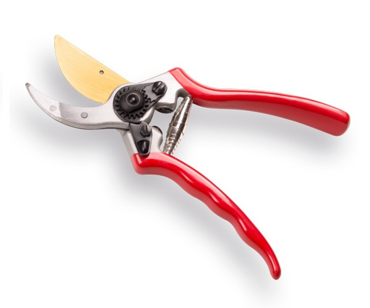 Het boven- en ondermes zijn gemaakt van hoge kwaliteit SK3 Japans staal. Het bovenmes heeft daar overheen nog een extra titanium coating voor langdurige scherpheid. De tandmoer zorgt voor een eenvoudige, nauwkeurige afstelling van het boven- en ondermes. Dit resulteert in een perfect gladde wond waardoor herstel snel mogelijk is. De gesmede handgrepen van geanodiseerd aluminium zorgen voor kracht en duurzaamheid. De snijcapaciteit van de snoeischaar is 25 mm. De snoeischaar heeft twee openingsstanden, een stand voor grote en een stand kleine handen.